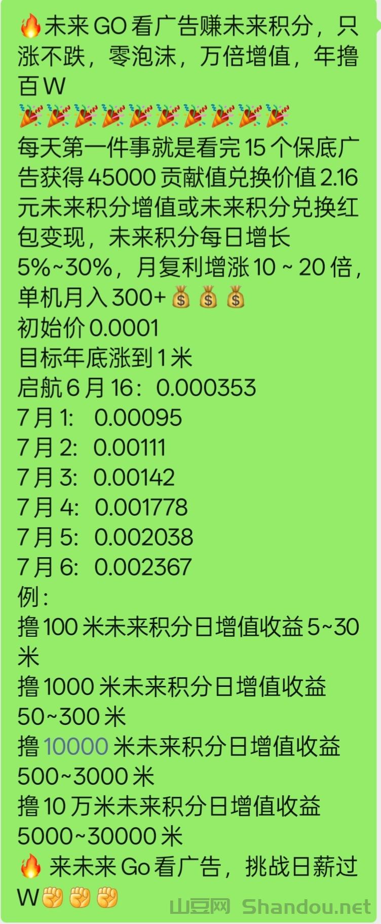 正文 未来GO,一条广告保底0.3元 admin V管理员 /01-04/2阅读/0评论 0104 未来go ,保底一个广告0.3看广告得贡献值贡献值换未来积分未来积分时间越久价格越高未来积分兑换红包直接提推广10代收益微信扫码注册邀请码wwidnan4 声明:本站提供的内容信息和网络资源均来自网络收集整理和用户投稿,仅限用于学习和研究目的,不得将上述内容用于商业或者非法用途,否则后果自负,版权争议与本站无关。若为网络资源,用户须在下载后24小时内删除,若您喜欢该网络资源,请支持正版,付费购买后可得到更好的正版服务。我们非常重视版权问题,如有侵权请与我们联系处理。