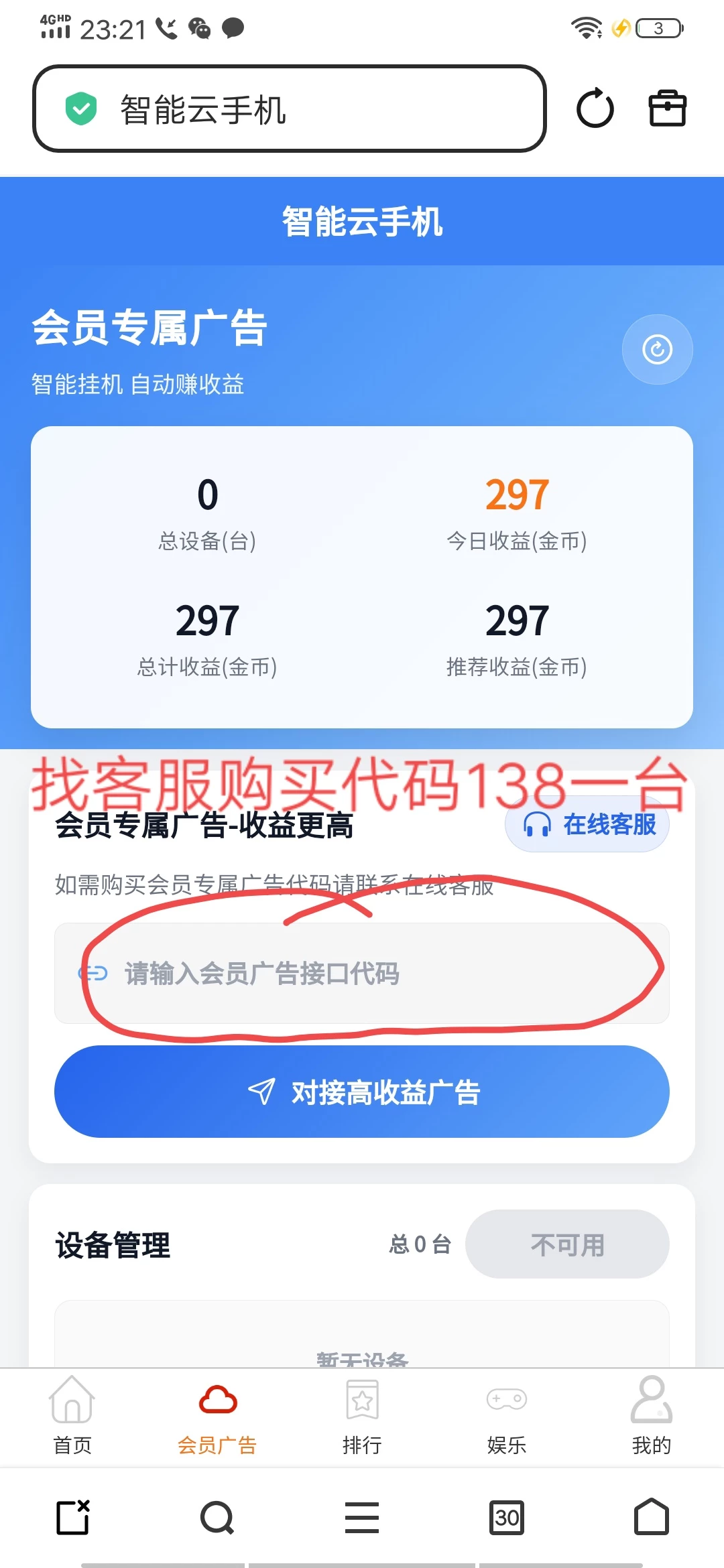 《云创智能》副业模式。(138元购买代码,一天15元左右,可多买几台) 手机观看广告获得收益 一,项目简介 手机看广告赚收益,是一种随时随地可操作的轻创业/兼职项目。每台手机的串码和IP都是独一无二的, 用户只需在手机上对接上广告代码,完成广告观看、互动、点击等简单任务,即可获得现金奖励、金币或佣金,操作简单、收益稳定, 适合个人、工作室批量操作。