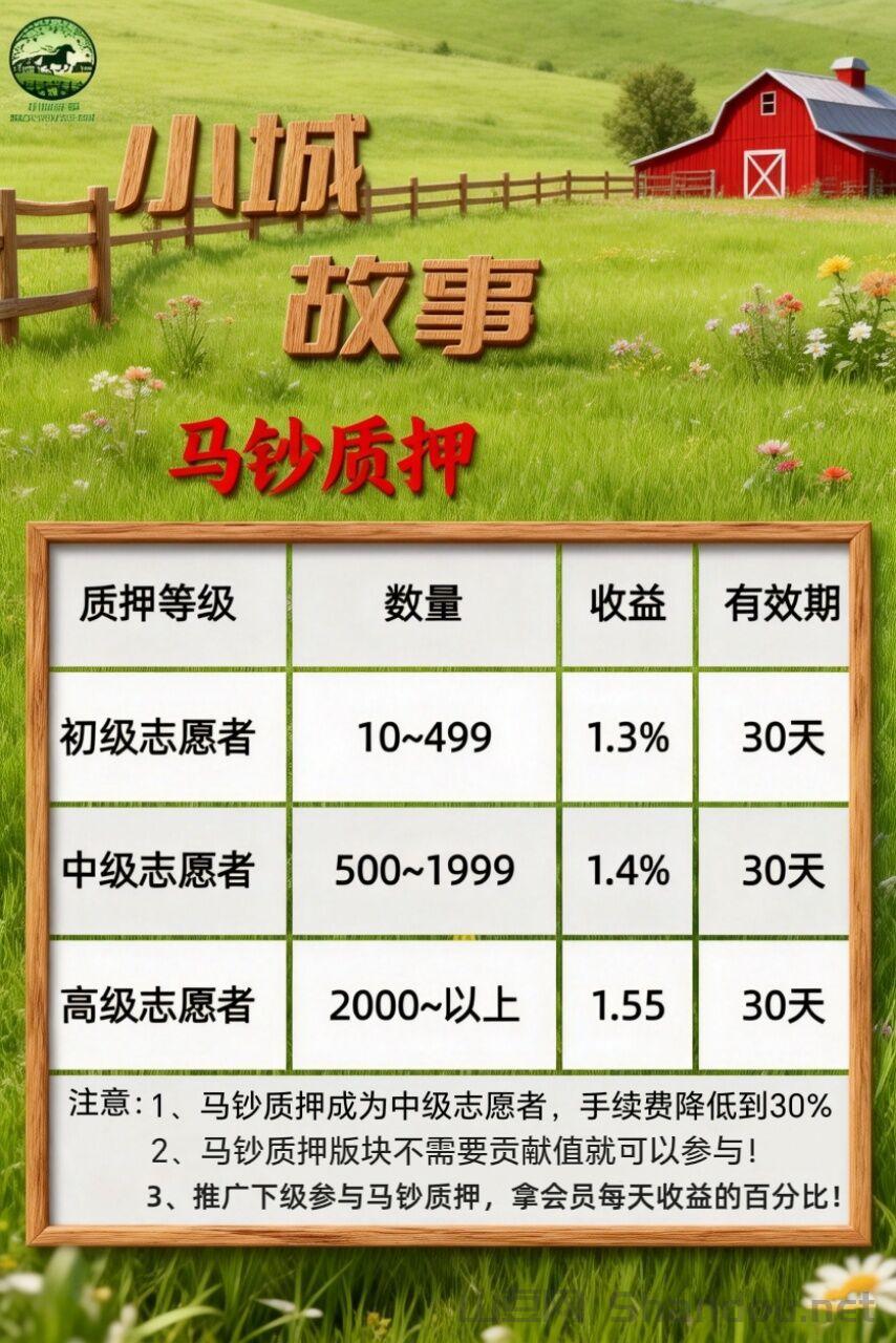 质押马钞升级中级志愿者,交易手续费直降至30%;下级质押马钞,上级可享质押比例收益,长期稳定赚复利