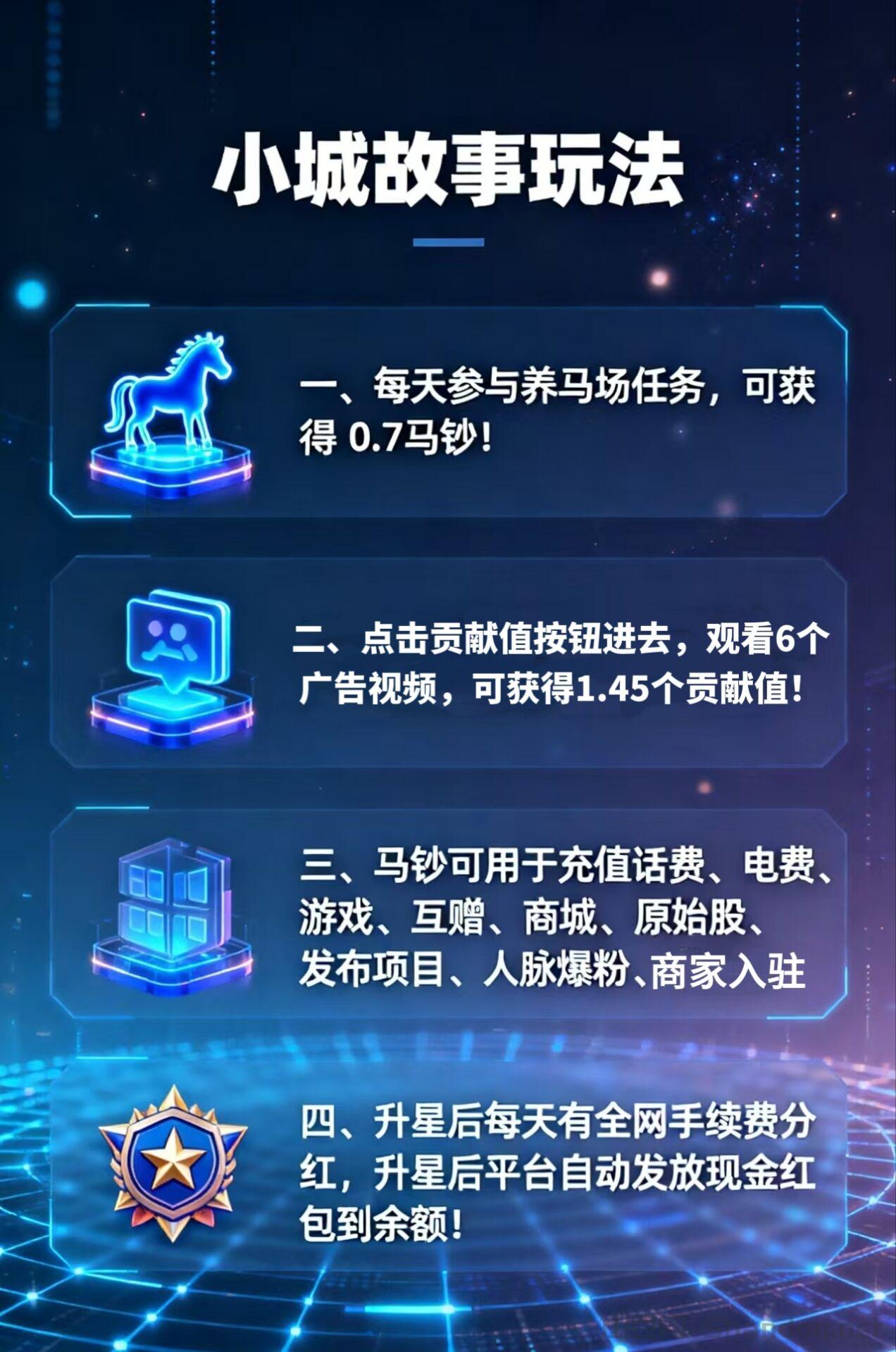 2. 每日任务:开通专属养马场,每天完成6个广告任务,每日稳定领取0.7个马钞